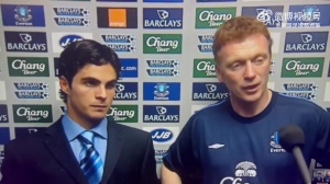 画面中是穿球衣的莫耶斯和23岁穿西装的阿尔特塔,在2005年埃弗顿主场2-0击败纽卡斯尔,锁定英超前四后接受采访。