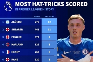 英超历史戴帽榜:阿圭罗12次、希勒11次,哈兰德8次、帕尔默4次