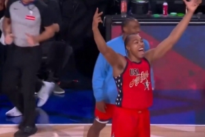 体育资讯2月16日讯 NBA全明星正赛循环赛,世界队加时35-37惜败美国新星队。