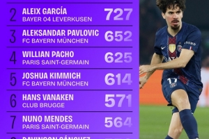 本赛季欧冠成功传球榜:维蒂尼亚断层领跑,阿莱克斯·加西亚次席