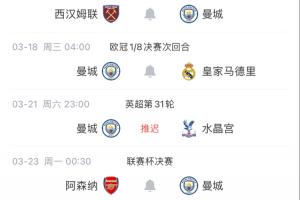 体育资讯02月27日讯 曼城3月8日开始死亡赛程,15天内连战纽卡(足总杯)、皇马(欧冠两回合)以及阿森纳(联赛杯决赛)!