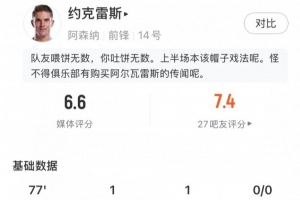 约克雷斯数据:传射建功,预期进球2.02,错失进球4,评分6.6