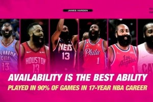 骑士VS魔术,转播方晒出一则哈登数据:生涯17个赛季,哈登出战了90%的比赛,配文写道:“出勤率是最好的个人能力。”