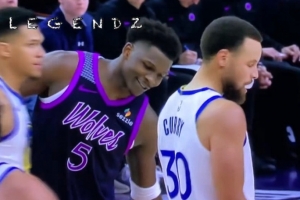 体育资讯1月29日讯 在此前森林狼对阵勇士的比赛中,爱德华兹在场上和库里交流,当时美媒给出了解读为,爱德华兹打趣库里,让他申请交易,并与自己和戈贝尔组队。