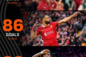过去两个赛季,利物浦38轮联赛均打进86球。也就是说,剩余的7场联赛,即便红军每场比赛打进5球也无法和过去两个赛季的进球数匹敌。