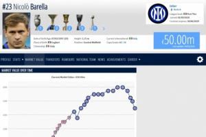 自2024年年底以来,巴雷拉的身价一路从生涯最高的8000万欧跌到7500万、6500万欧、6000万欧以及今天的5000万欧。目前巴雷拉的身价仍排在意大利籍球员第三,意甲球员第六,国米队内第三。