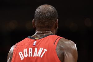 第三节,火箭球星杜兰特火力全开,单节9中6独得16分,三节打完21投11中,三分7中2、罚球4中4砍下28分4篮板3助攻,正负值+9。